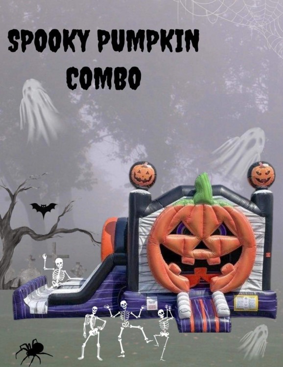 Spooky Pumpkin: Imagine a giant, inflatable jack-o'-lantern that sets the scene for eerie fun at every fall festival or Halloween party. This vibrant orange bounce house is adorned with spooky characters, perfect for jumping and laughter. Its festive design brings the thrill of autumn adventures, making it an unforgettable centerpiece for anyone looking to add a playful scare to their celebration. Dive into a world of bouncy fun with this spooky delight!